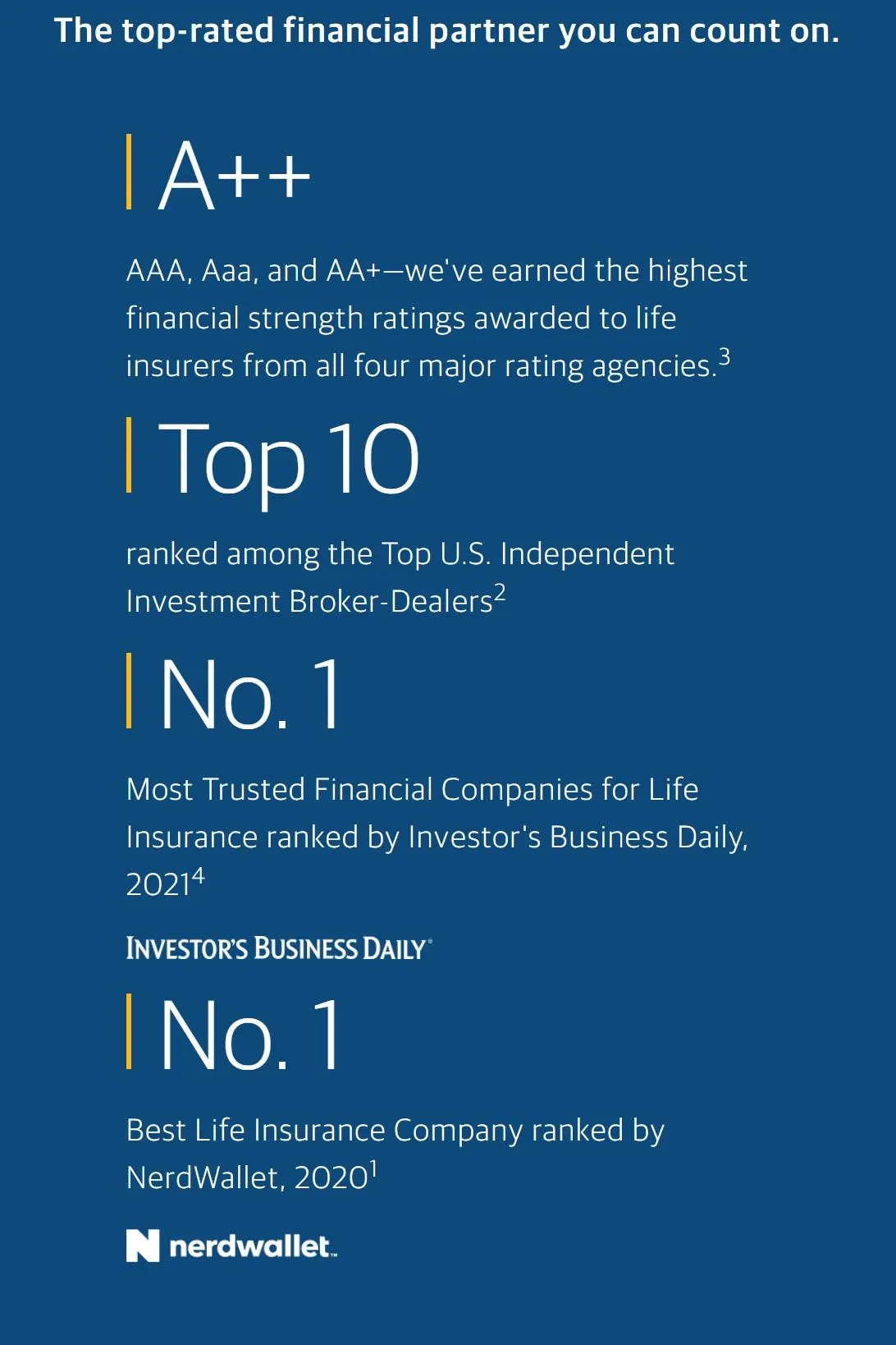Northwestern Mutual continues to have the highest financial strength ratings awarded to any U.S. life insurer by all four of the major rating agencies: A.M. Best Company, A++ (highest), April 2020; Fitch Ratings, AAA (highest), August 2020; Moody’s Investors Service, Aaa (highest), December 2020; S&P Global Ratings, AA+ (second highest), June 2020. Third-party ratings are subject to change. Ratings are for The Northwestern Mutual Life Insurance Company and Northwestern Long Term Care Insurance Company.